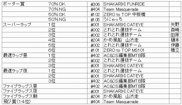 * 【総合順位&カテゴリー順位】 ・ ※カテゴリー・・・WR:ワークス&レーシー PT:ペア&トリオ MM:ミックス ME:エンジョイ MS:ソロ 【競技表彰】 ・ 【サブメニュー表彰】 ・ * |